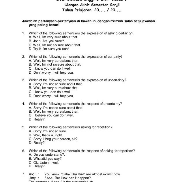Soal berikut terdiri dari 20 soal pilihan ganda berserta kunci jawabannya dan dapat didownload secara gratis. Jika ada sedang mencari contoh soal teks ulasan dan jawabannya. Berikut kunci jawaban untuk soal cause and effect di atas. Soal bahasa inggris pilihan ganda. Dalam menjawab soal pilihan ganda, terkadang memang keajaiban itu kadang terjadi. 50 contoh soal objective personal letter. Latihan soal pilihan ganda offering help latihan soal pilihan ganda offering help tentu saja anda pernah meminta atau menawarkan bantuan kepada orang lainmungkin anda tidak perlu berpikir panjang tentang kata yang harus diucapkan ketika bercakap cakap dalam bahasa indonesia. Penjelasan materi caption bahasa inggris lengkap beserta contohnya. Based on the dialog, these are signal words. Gas yang dipakai untuk proses pengelasan gas tunsten adalah: Prediksi soal unbk ujian nasional procedure text. Dibawa ini termasuk perangkat yang dipakai prose pengelasan las gas tungsten kecuali : 40 soal pilihan ganda + jawaban karya ilmiah kelas 11.